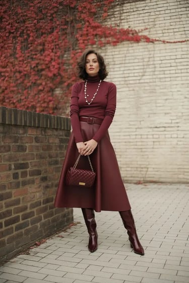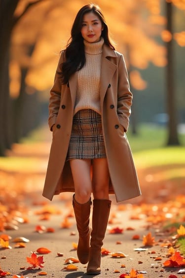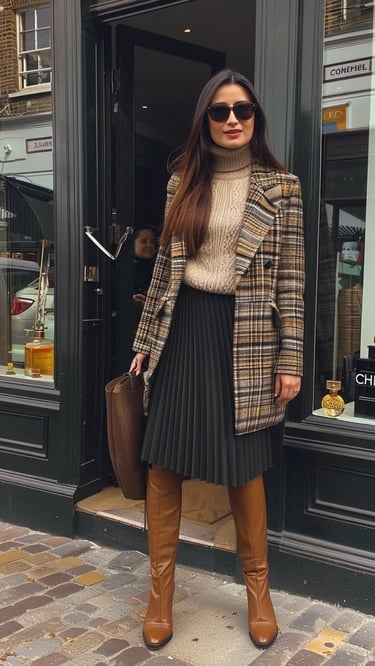 Smooth, uninterrupted, graceful. Your silhouette becomes one long line — a ballerina’s leg, not a broken ruler.Option B: Short Skirt + Tall Boots + Matching Tights